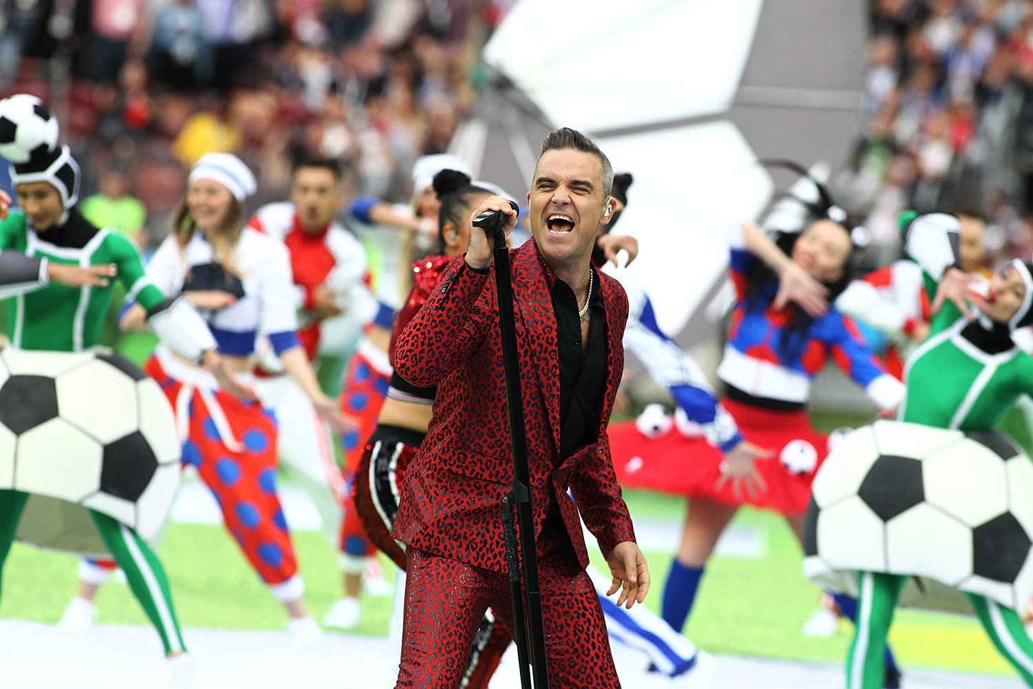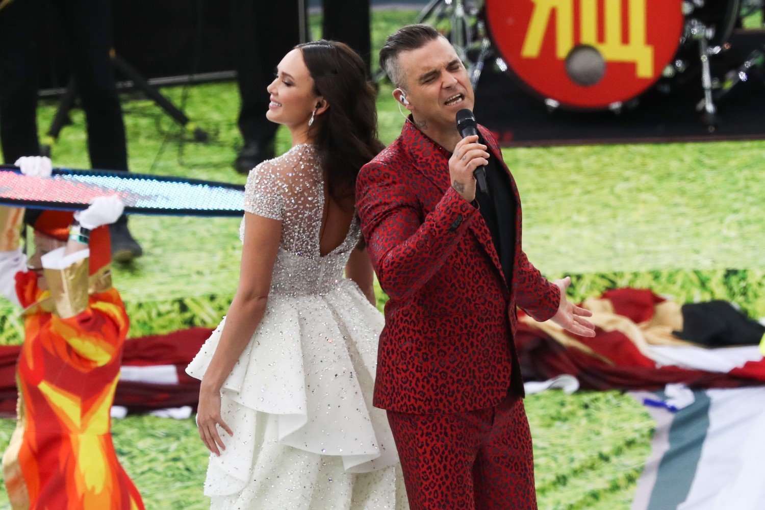 Британский поп-певец Робби Уильямс исполнил свои лучшие хиты. К нему присоединилась российская оперная певица Аида Гарифуллина, и они вместе спели красивую балладу. В этот момент 32 артиста в авангардных костюмах вышли на поле с флагами команд-участниц ЧМ.