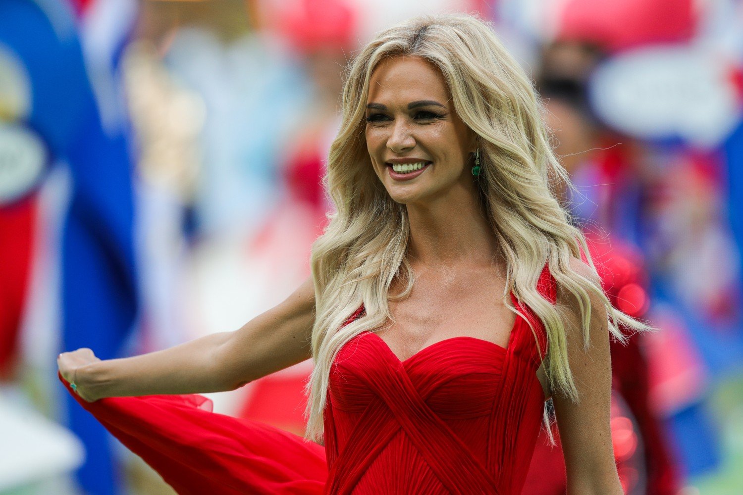 Официальный мяч ЧМ-2018 вынесла на поле телеведущая, посол мундиаля Виктория Лопырева и отдала его талисману турнира волку Забиваке.
