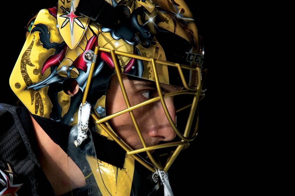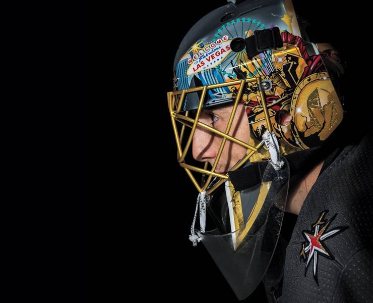 Игровая маска голкипера «Вегаса» выполнена в черном, сером и золотом цветах. С левой стороны изображены достопримечательности Лас-Вегаса: колесо обозрения «High Roller», копия Статуи Свободы, башня легендарного казино «Стратосфера», отель-пирамида «Луксор» и культовый неоновый знак с надписью «Welcome to Fabulous Las Vegas».