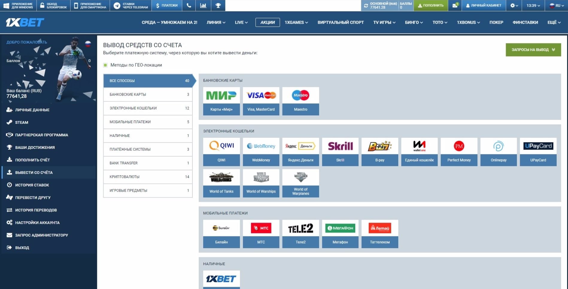 Этим вопросом задается каждый игрок, который заработал на ставках. Все просто. Через Личный кабинет вы можете выводить средства на электронные кошельки (Яндекс.Деньги, QIWI, WebMoney и пр.), счета банковских карт (Visa, MasterCard, Maestro и пр.) или на мобильный телефон. Выводить средства можно в рублях, евро, долларах и турецких лирах.